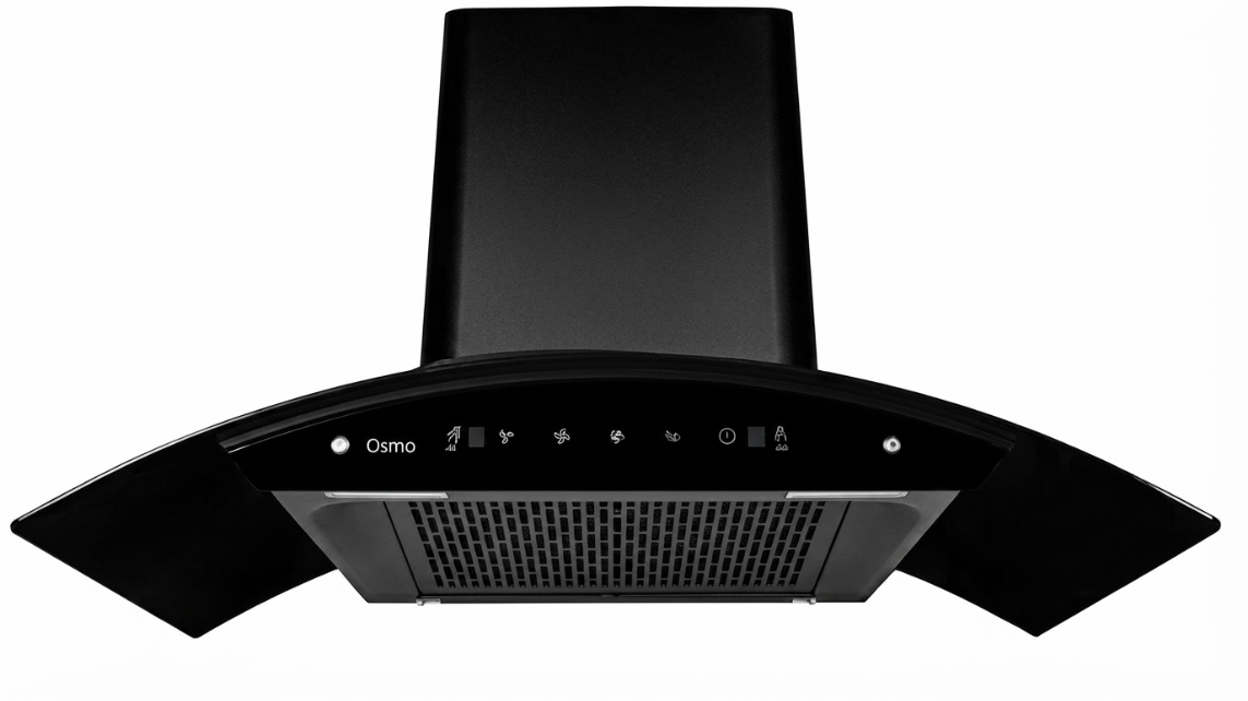 The Osmo Valico is a stylish 90 cm kitchen chimney featuring a sleek black powder-coated finish with tempered glass. It offers powerful 1350 m³/h suction with a durable metal blower and advanced 3-speed touch and gesture controls. Designed for convenience, it includes a stainless steel oil collector, dual 1.5W LED lamps, and modern filterless technology in a black finish—perfect for efficient and elegant kitchen ventilation.